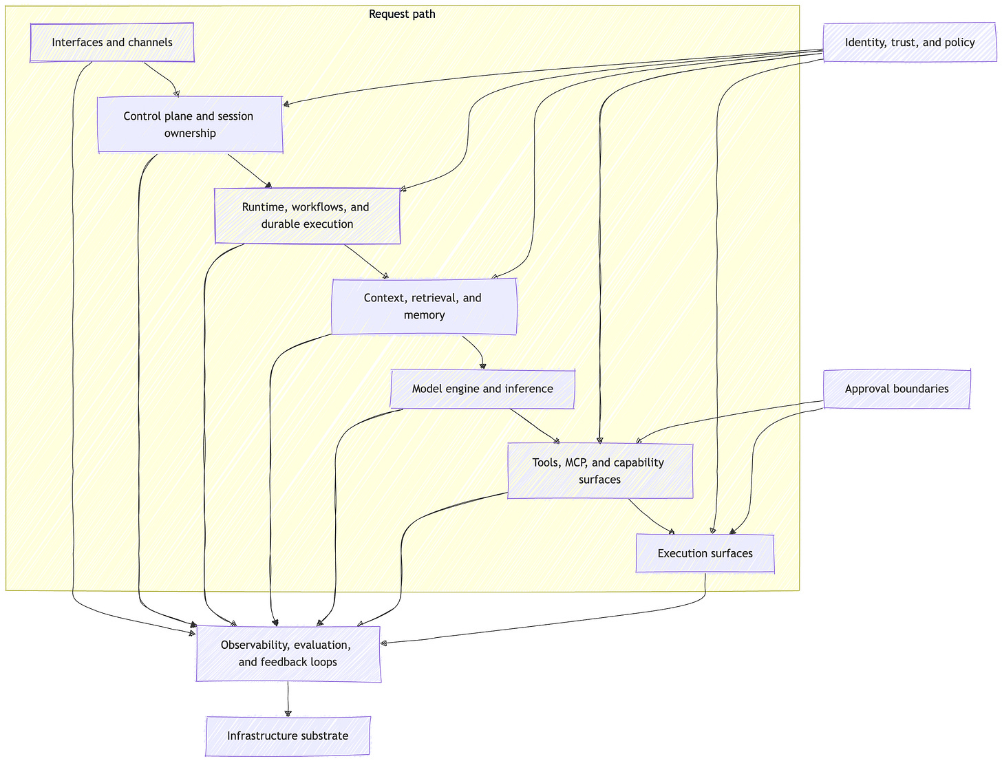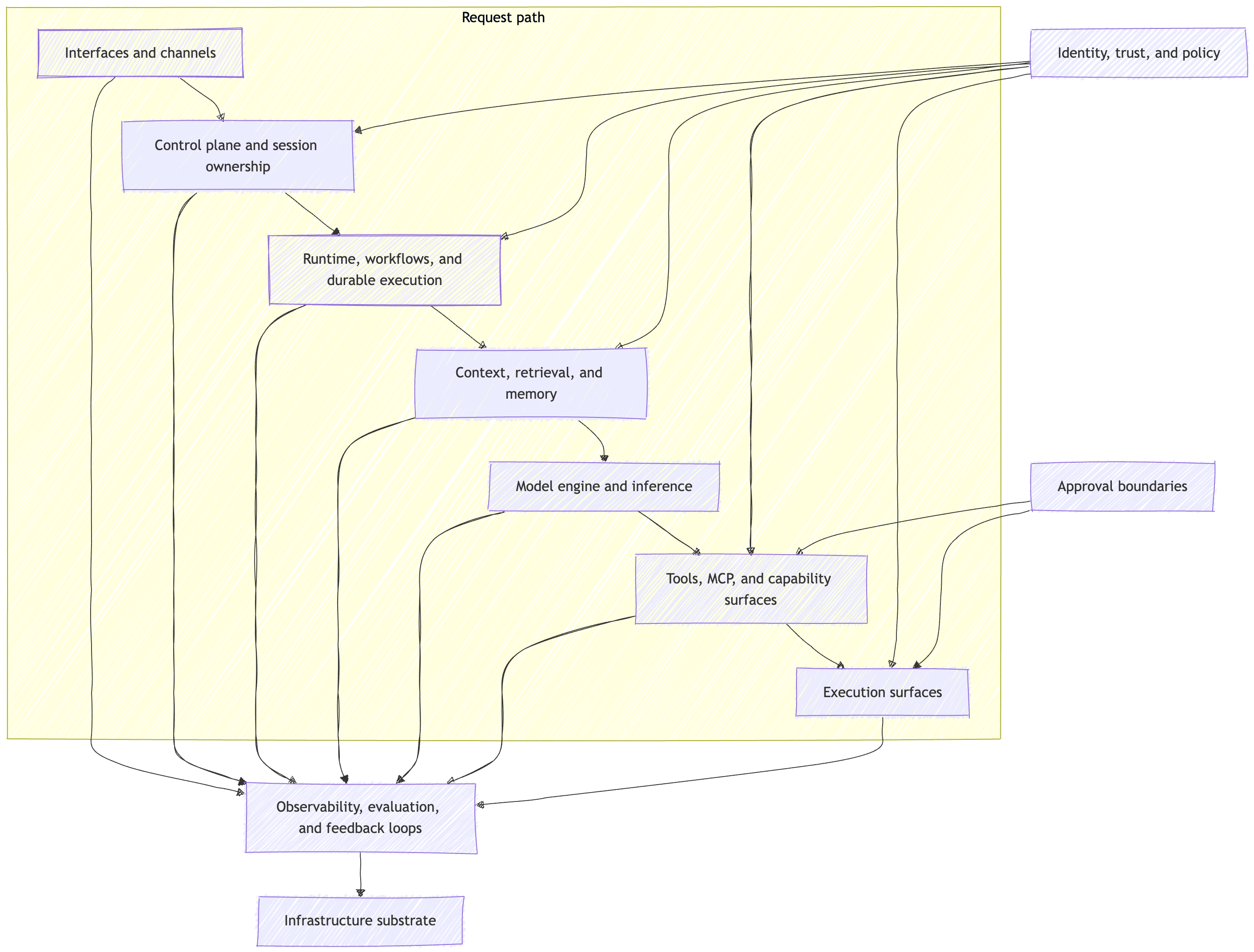 My read is that the cleanest v1 is not a pure vertical stack. It is a request path, wrapped by trust and operator layers, with approvals appearing where side effects become real, all sitting on top of shared infrastructure.