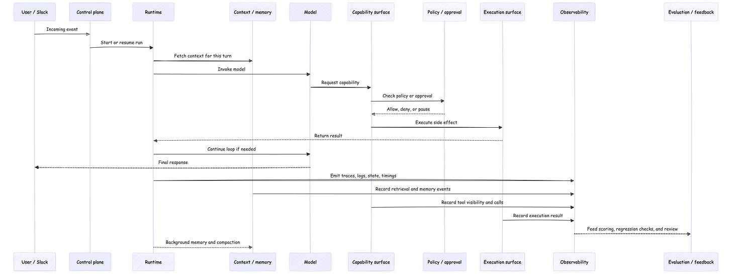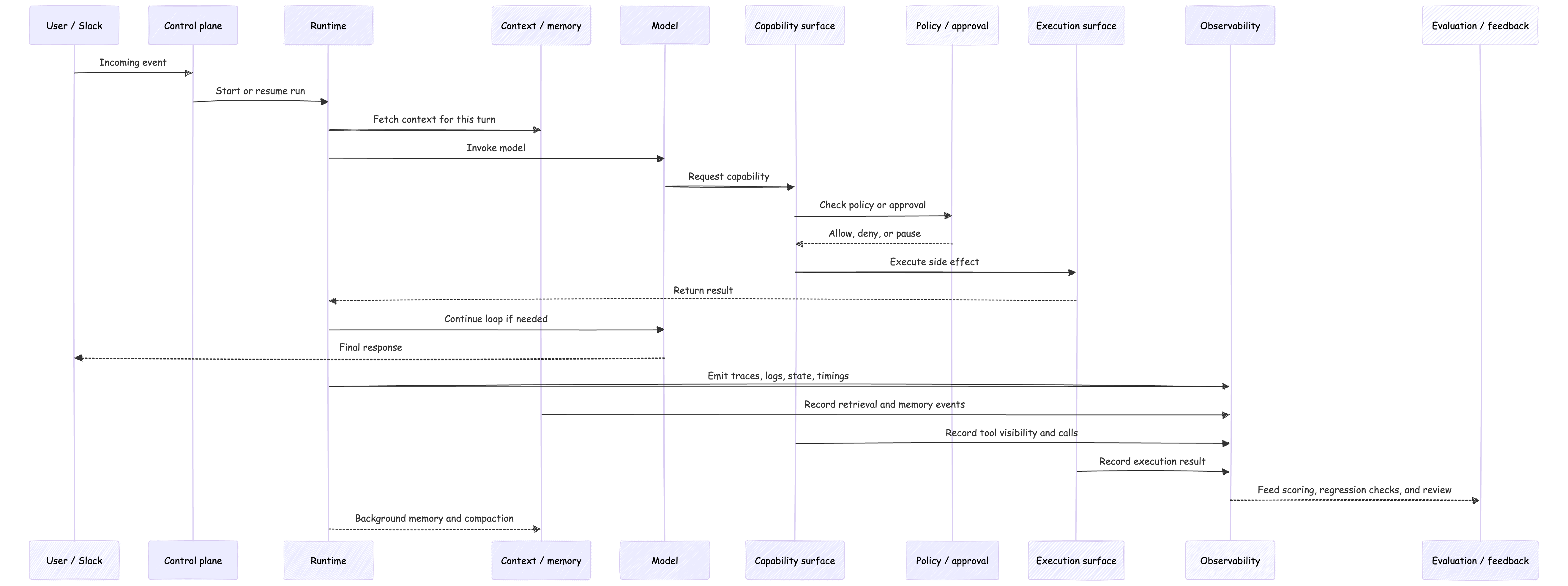 The model is the part we talk about. But before anything useful happens, the system has to answer less glamorous questions. Which session owns this turn? What context belongs on the hot path? Which tools are visible? If a side effect follows, who approved it?