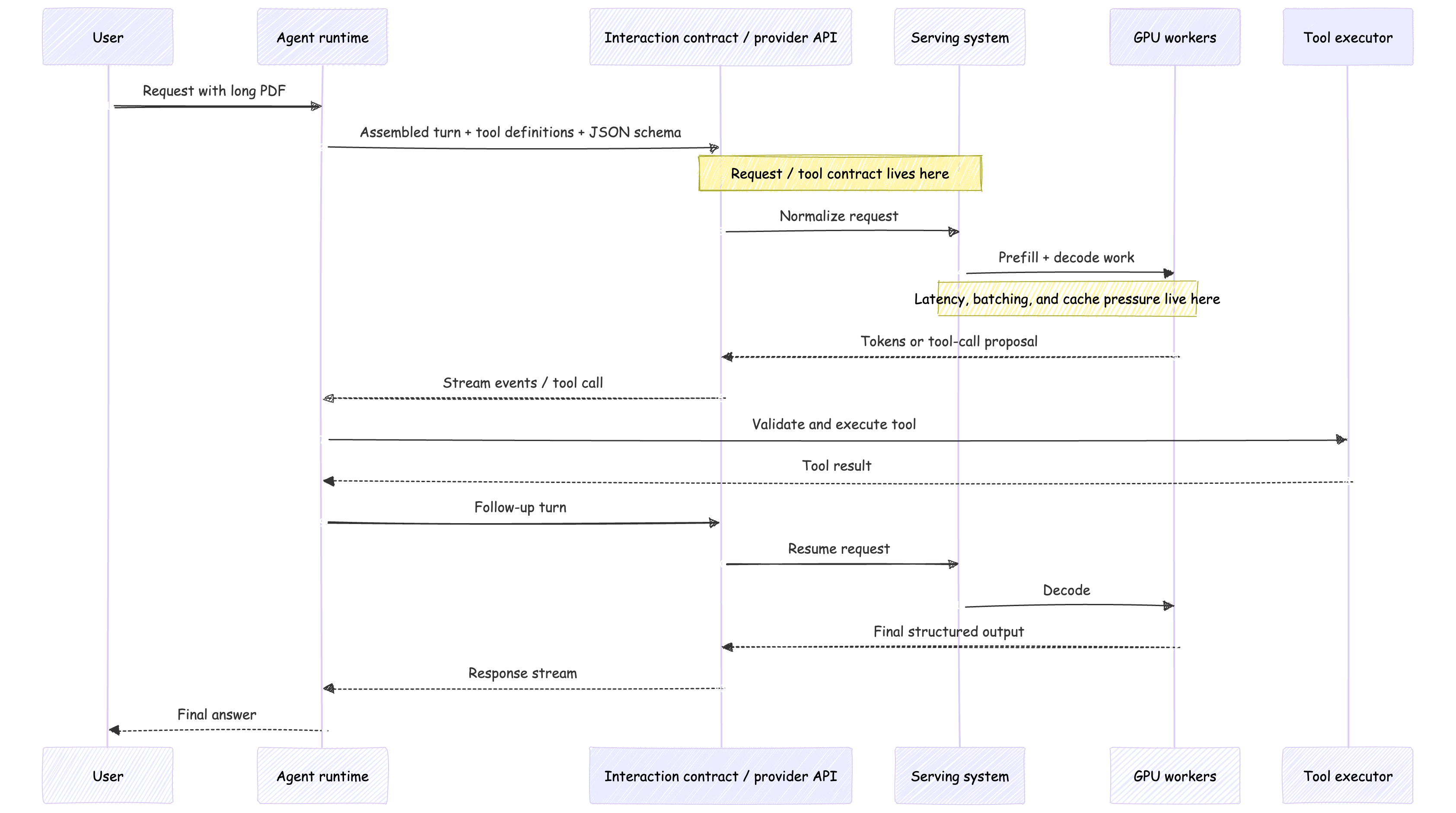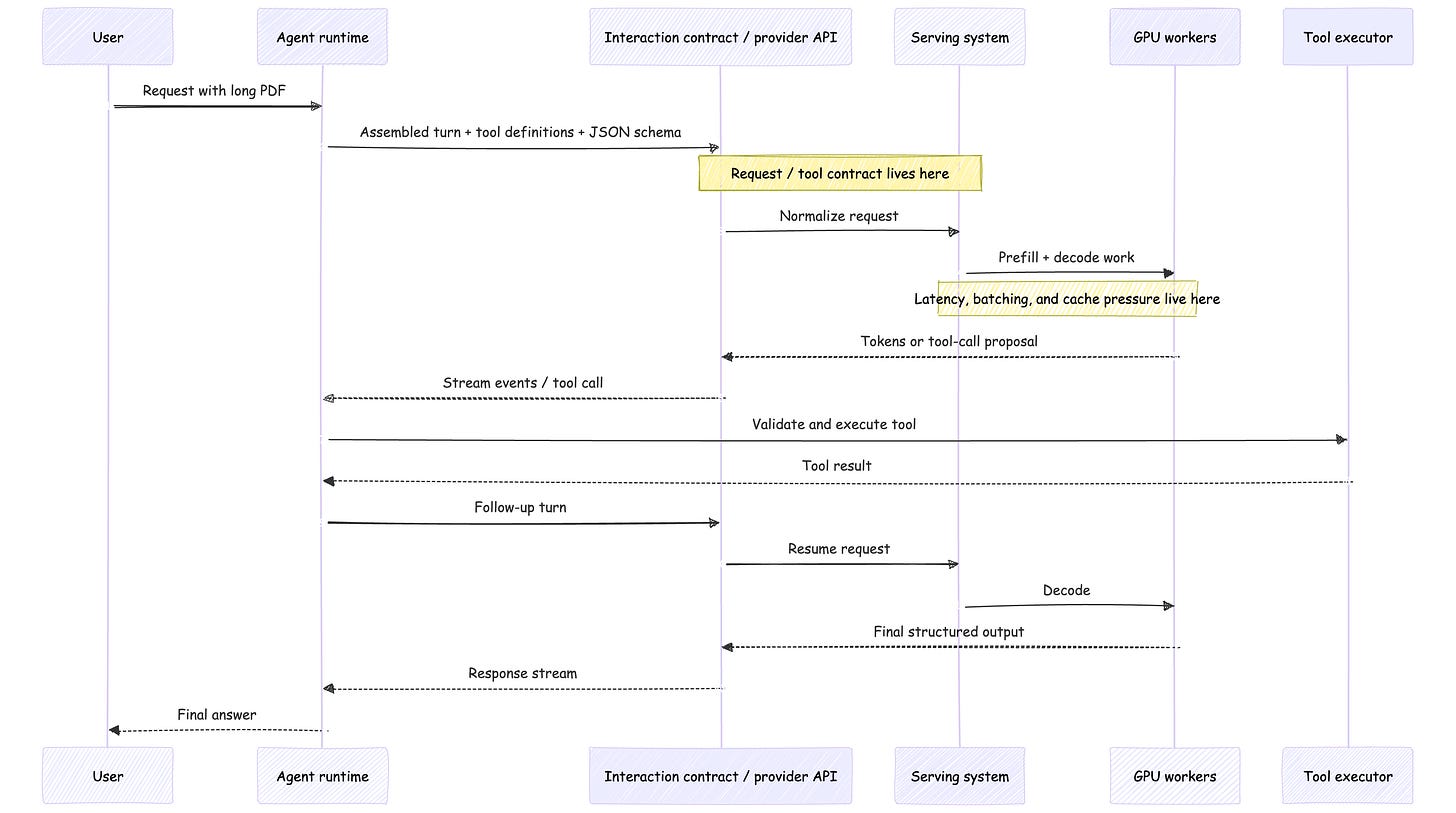 The model asset sets the token budget and modality limits. The serving system pays the prefill cost, manages cache pressure, and determines how gracefully that large request coexists with everything else on the box. The interaction contract decides how the document is packaged, how the tool call is represented, how streaming behaves, and what “strict JSON” actually means on the wire.