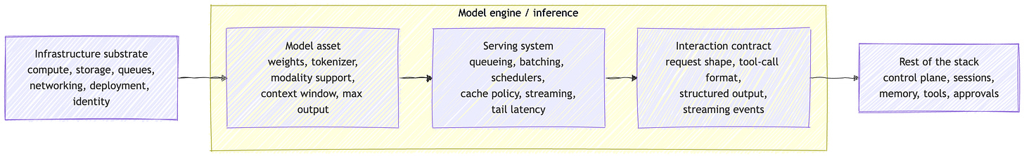 This post is about the contract every agent system inherits before it gets a control plane, memory, or approvals. My read is that the cleanest lower-layer model starts with two layers, infrastructure substrate and model engine, then splits the model engine into model asset, serving system, and interaction contract.